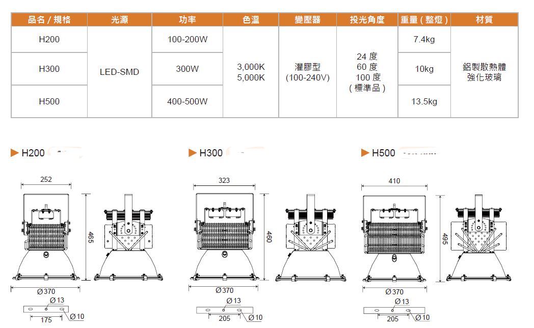 • 瓦 數:LED100-200W /300W /400W-500